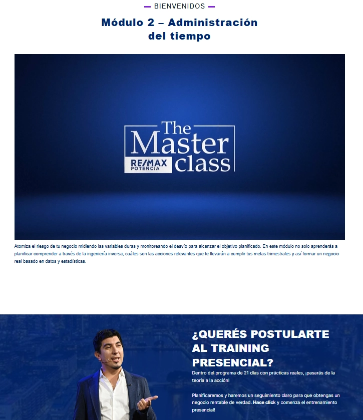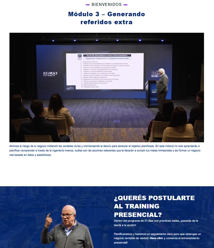 Accedé a 21 días de entrenamiento presencial donde llevarás la teoría a la acciones. Accedé a: Practicas reales, herramientas de gestión, planificación y medicion de objetivos, manejo de finanzas, marca personal, aumentar el ticket, sistema de referidos, desarrollos inmobiliarios y más!